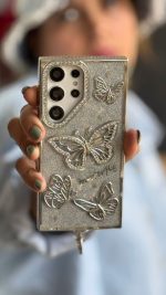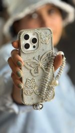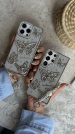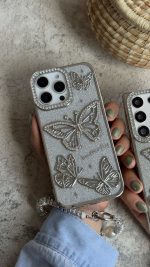 قاب موبایل ( آیفون – سامسونگ ) پروانه آموره نگین دار برجسته شاینی + بندست