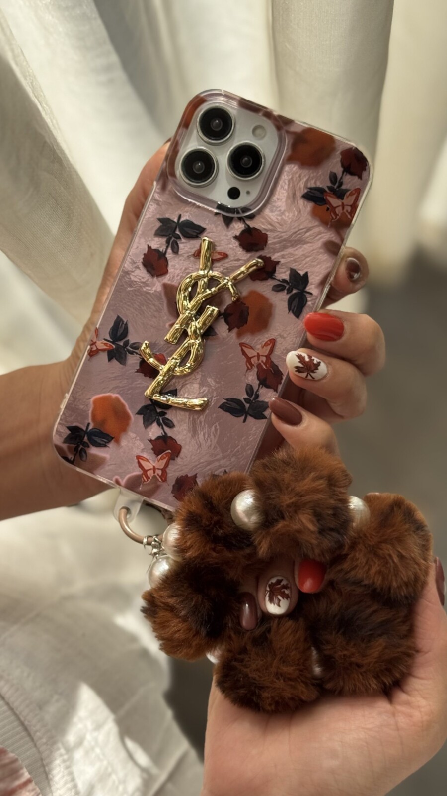 قاب موبایل آیفون سن لورن دم روباهی پروانه گل سرخ + بندست پشمی