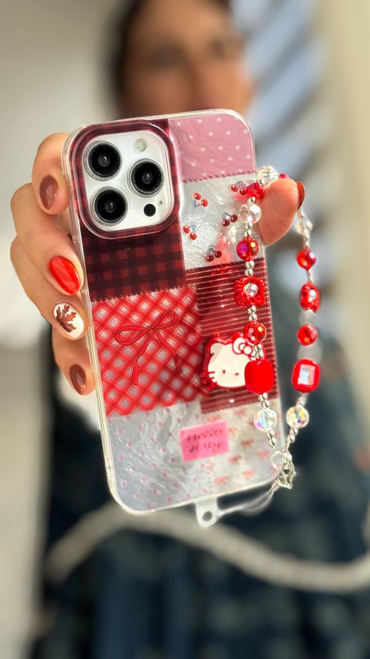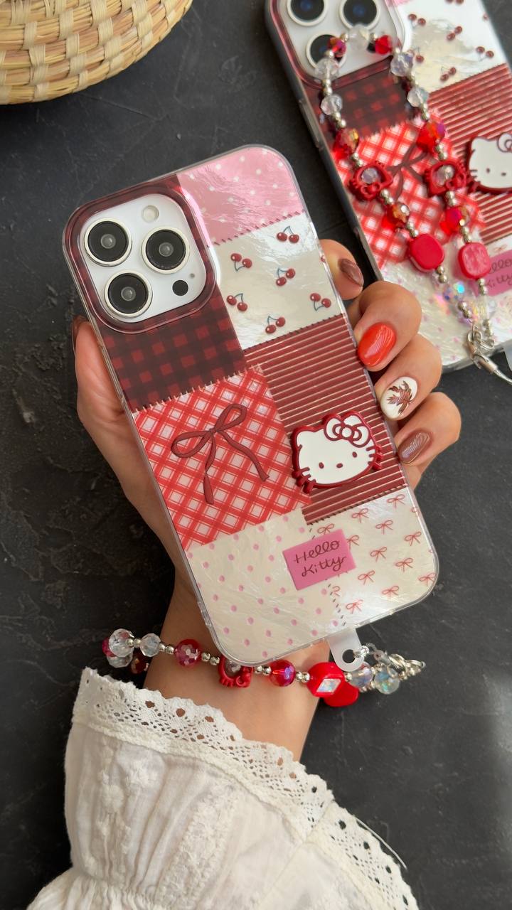 قاب موبایل آیفون کیتی چری آلبالویی پاپیون دار + بندست